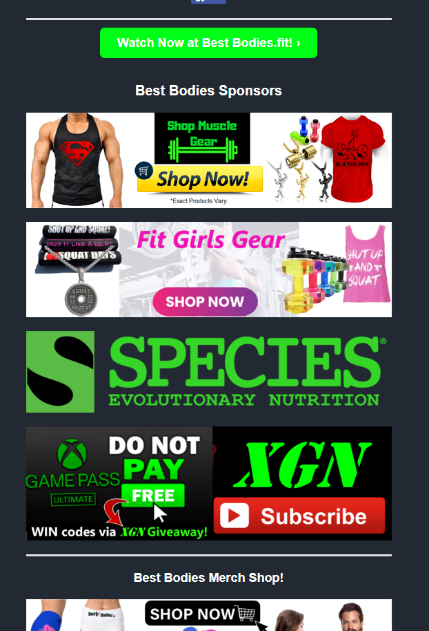 These fresh athletes look for daily news/updates about the Fit Model Division, hot gym wear, and nutritional supplements. This is why they subscribe to Best Bodies.fit and why you want your brand positioned here in 2025!