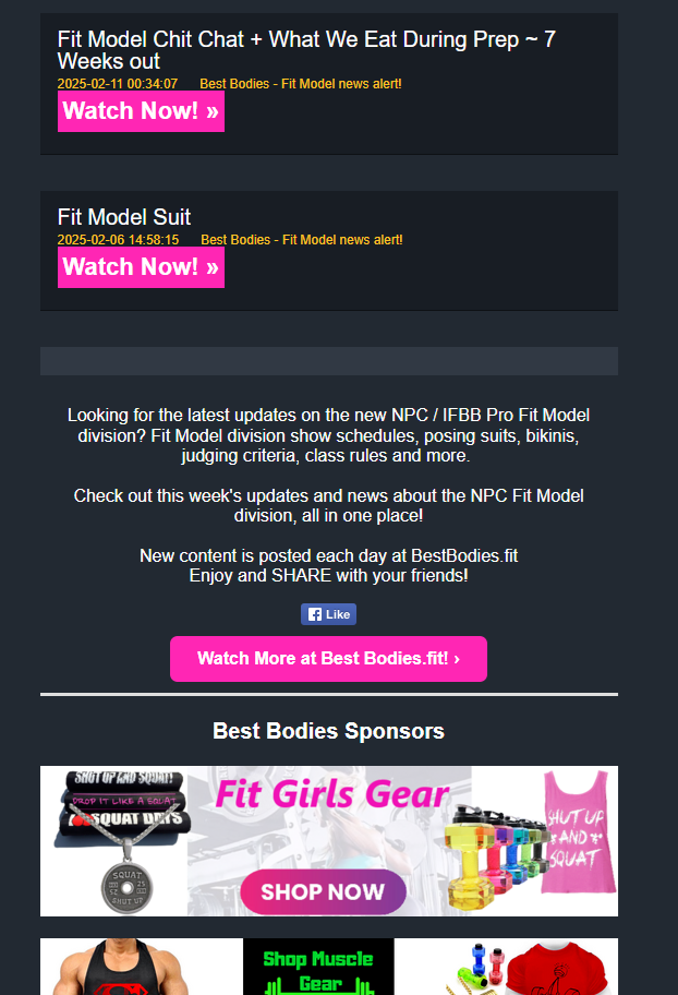 Who is our target audience? Bodybuilding/fitness industry consumers and gym goers. Additionally waves of new, aspiring athletes looking to compete in the NPC Fit Model Division! We are serving this influx of fresh female competitors with our Fit Model Daily Alerts page https://www.bestbodies.fit/p/fit-model